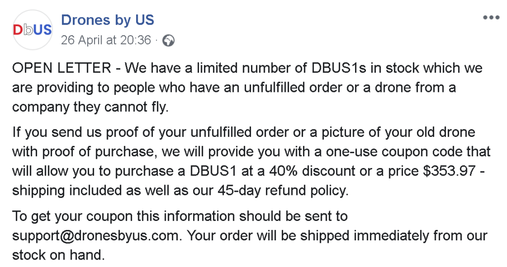 So yes. You did read that right: DBUS is offering Mota Group customers a 40% discount on the DBUS1, aka the Lily Next-Gen. A discount on a drone those customers have already paid for. No compensation, no refund, no replacement unit. Just another discount designed to appease customers who are surely sick of being let down.